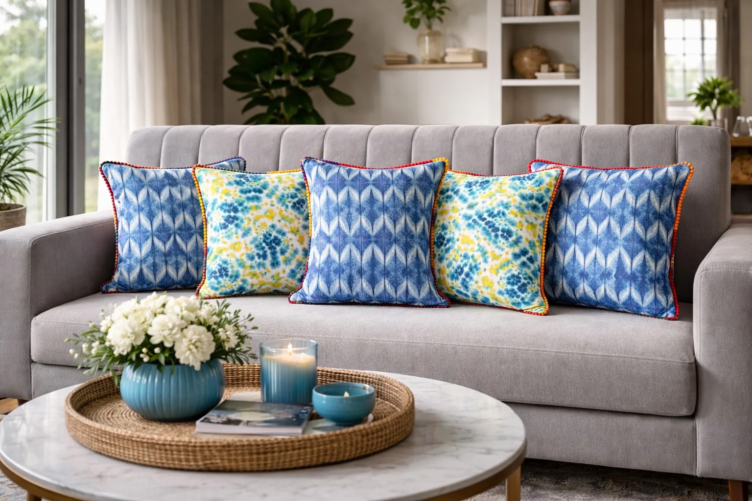 Diseñado para interiores contemporáneos de alta gama, este juego de fundas de cojín combina una cuidada selección de texturas y detalles. Confeccionado en algodón, el conjunto presenta diseños coordinados en tonos azul y neón que realzan sofás, camas y asientos auxiliares con un estilo impecable. Ideal para hogares urbanos modernos y como regalo sofisticado, este juego luce espectacular tanto completo como combinado con cojines lisos para lograr un aspecto equilibrado. Estampado tradicional tie-dye con encaje de pompones pequeños multicolor en contraste en los cuatro lados.