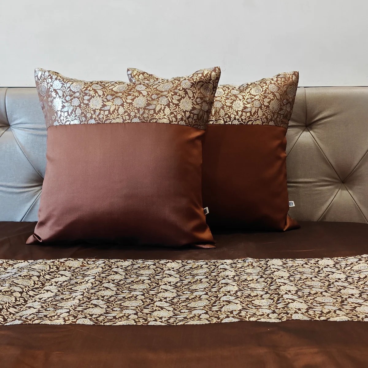 Diseñado en lujoso brocado Banarasi, este conjunto presenta intrincados detalles tejidos en tono marrón café que aportan calidez y sofisticación a tu espacio. Confeccionada en resistente brocado de poliéster, la colcha ofrece una caída suave y una apariencia duradera, mientras que las fundas de cojín a juego completan el conjunto coordinado.