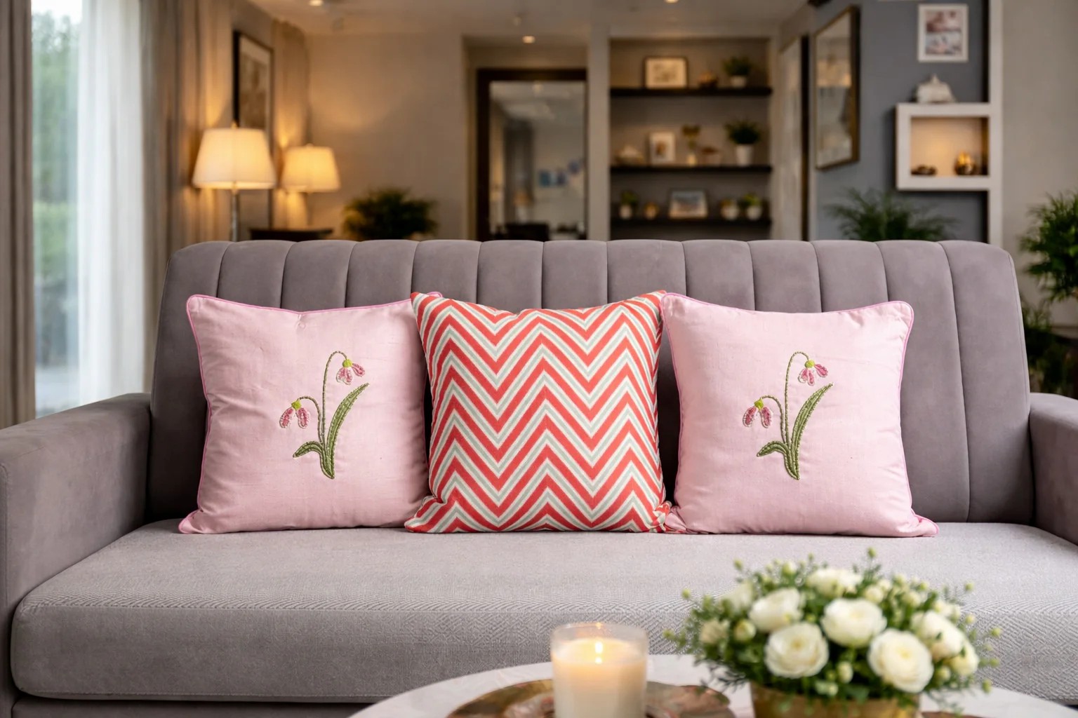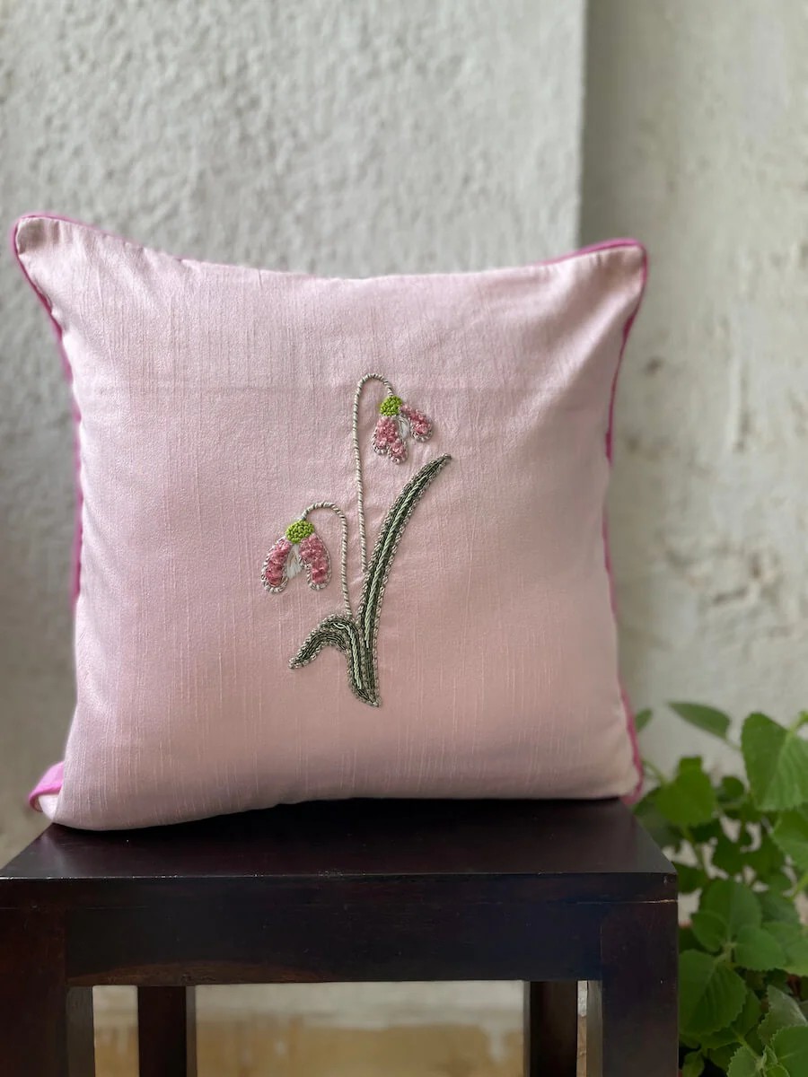 Diseñado para interiores contemporáneos de alta gama, este juego de fundas de cojín combina una cuidada selección de texturas y detalles. Confeccionado con seda Dupion y algodón, el conjunto presenta diseños coordinados en tonos rosa empolvado que realzan sofás, camas y asientos auxiliares con un estilo impecable. Ideal para hogares urbanos modernos y como regalo sofisticado, este juego luce espectacular tanto completo como combinado con cojines lisos para lograr un aspecto equilibrado. Diseño de capullo de flor con estampado de zigzag sobre algodón. El capullo de flor está delicadamente elaborado a mano y el bordado combina a la perfección con el estampado geométrico. Una historia completa.