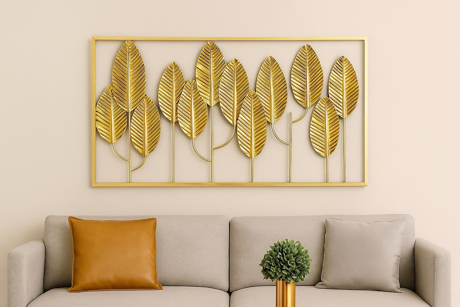 Elevate your space with the Divine Dazzle Metal Wall Art. This 114x76cm piece features hand-painted golden leaves in a sleek linear design, blending modern elegance with natural inspiration. Crafted from durable, rust-free iron with a gloss lacquer finish, it ensures lasting beauty. Effortless installation is guaranteed with pre-attached keyhole hooks. Perfect for living rooms, hallways, bedrooms, offices, and entryways, this versatile, frameless art complements various decor styles. A stunning handcrafted touch for your walls, ideal as a gift or to enhance any room's unique style.