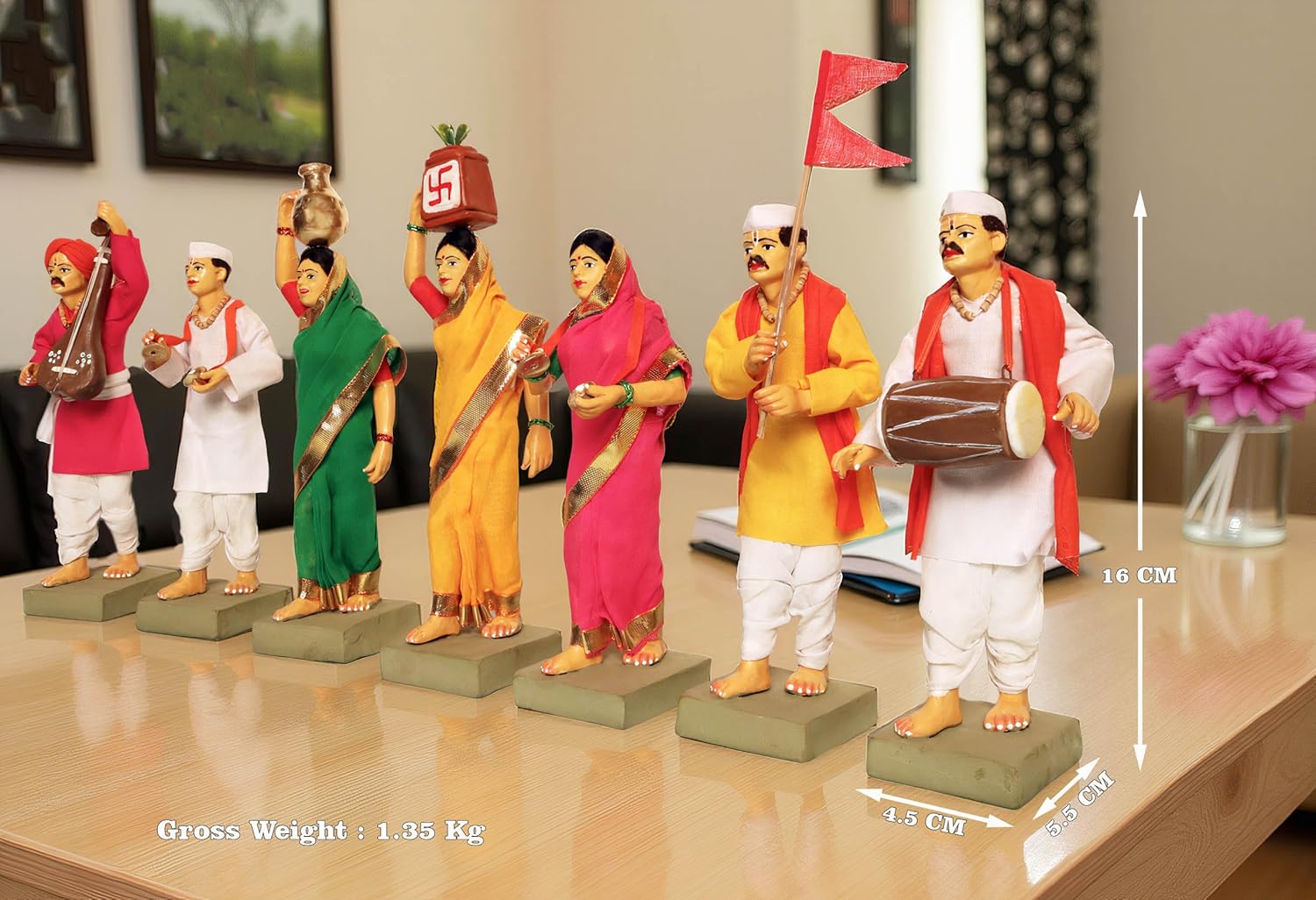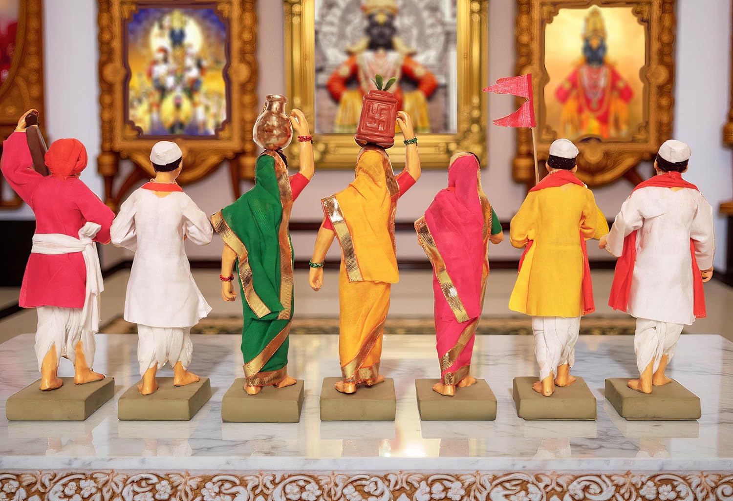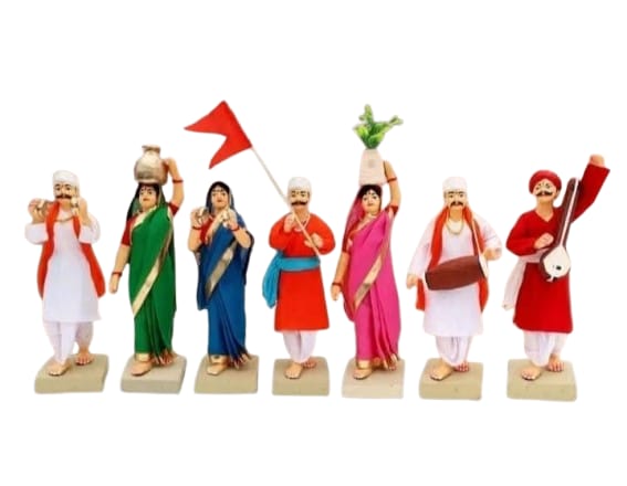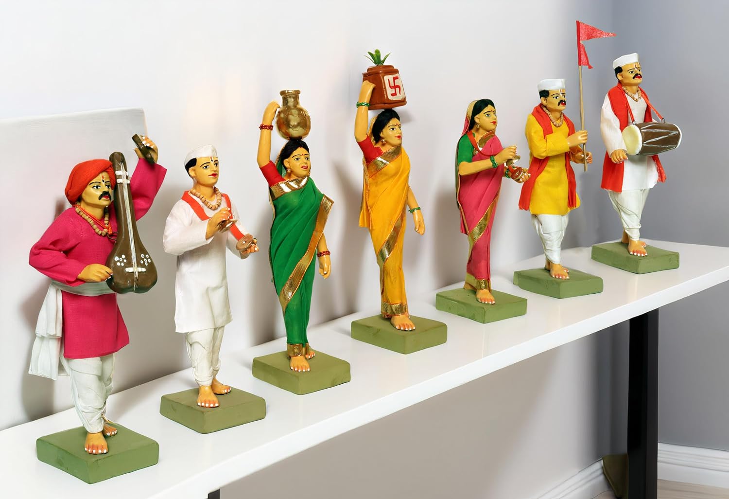 - ???? 20 cm Height | 7-Piece Set – Includes male and female Varkaris with dholak, veena, cymbals, tulsi pot & flags.