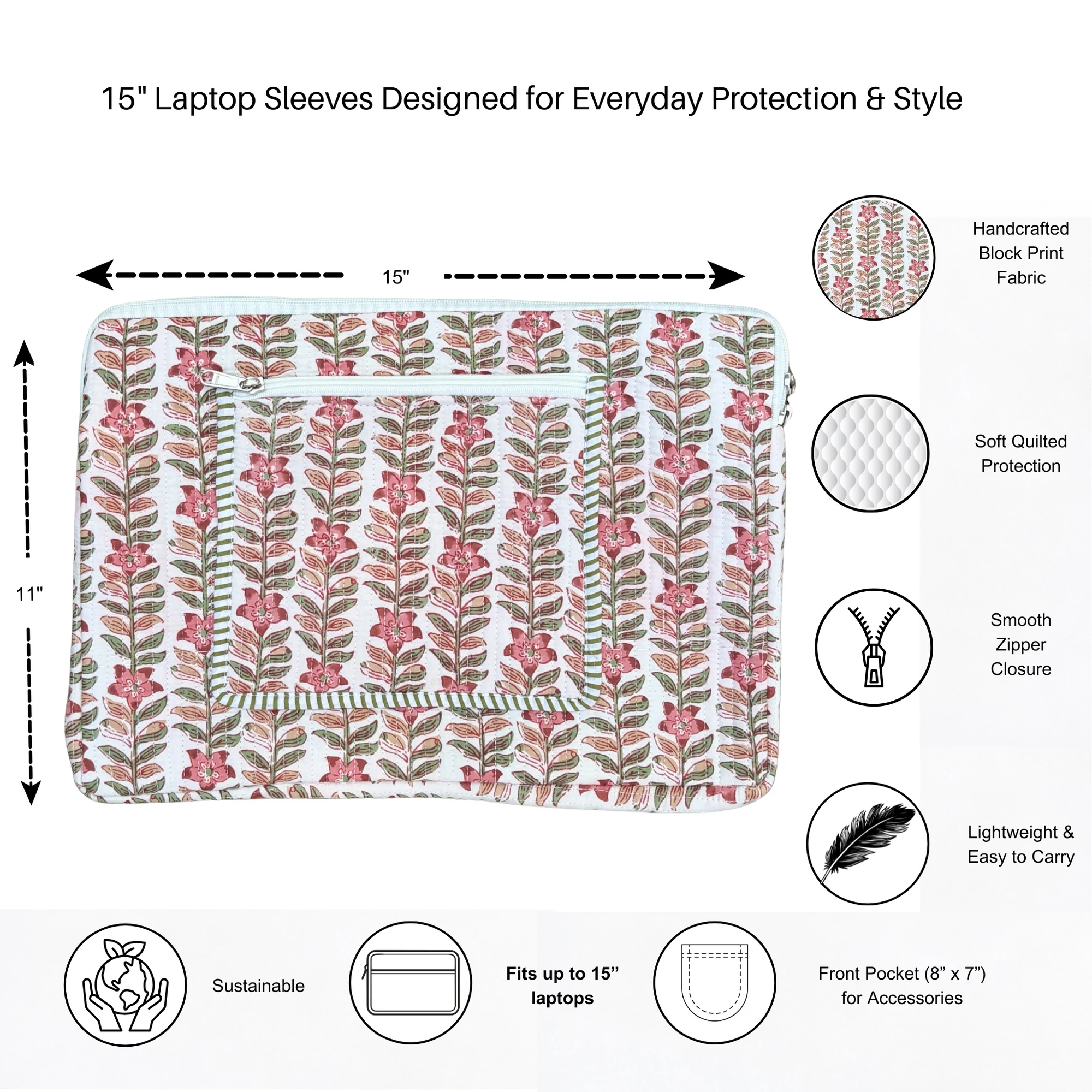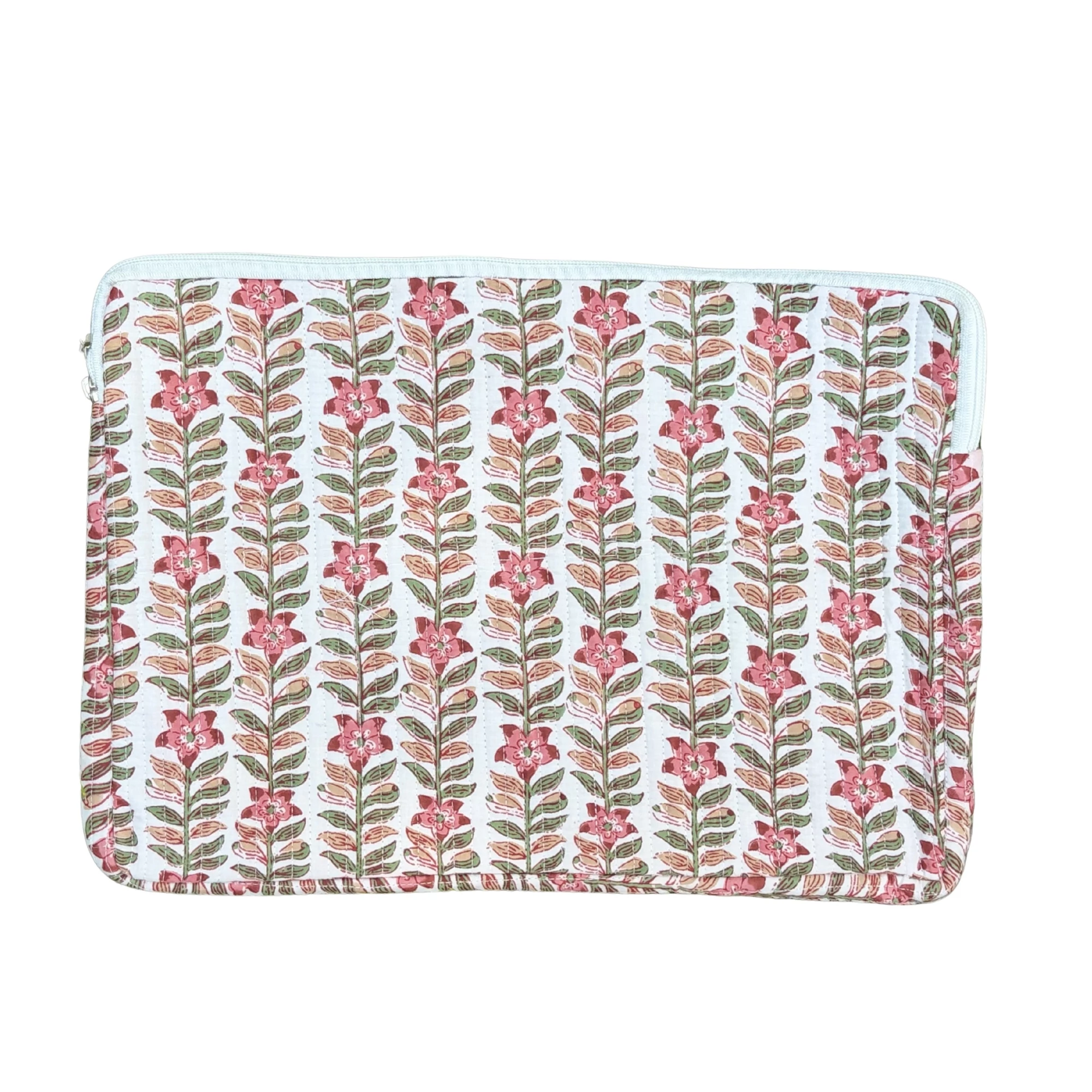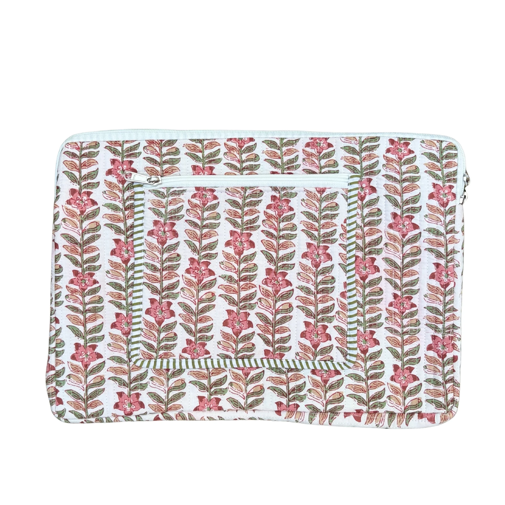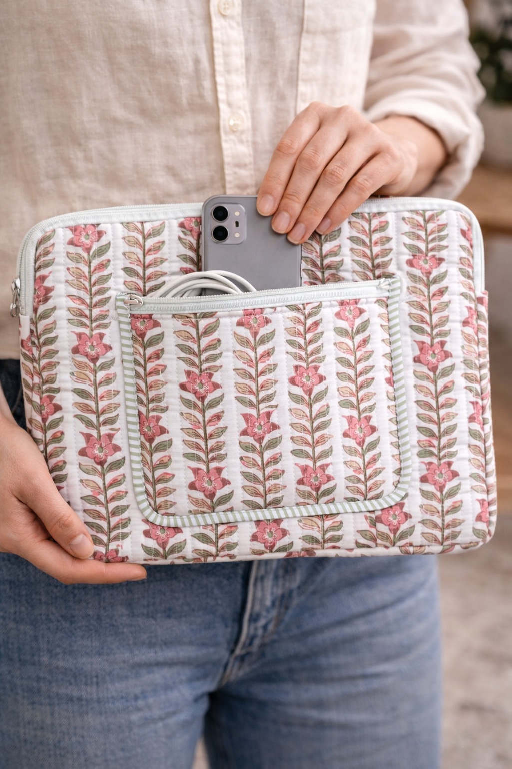Protect your device in style with this Block Print Quilted Cotton Laptop Sleeve with Front Pocket. Crafted from soft quilted cotton and adorned with traditional block print patterns, this sleeve combines heritage craftsmanship with everyday practicality.