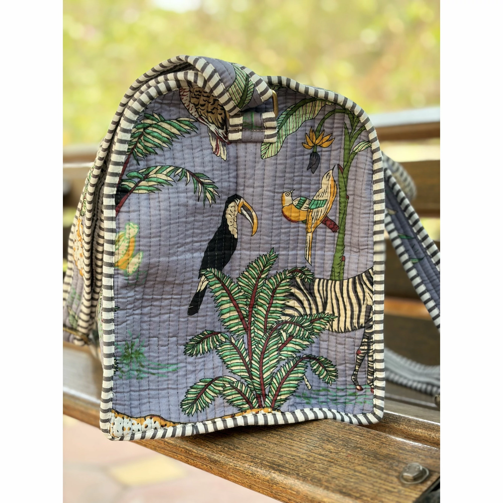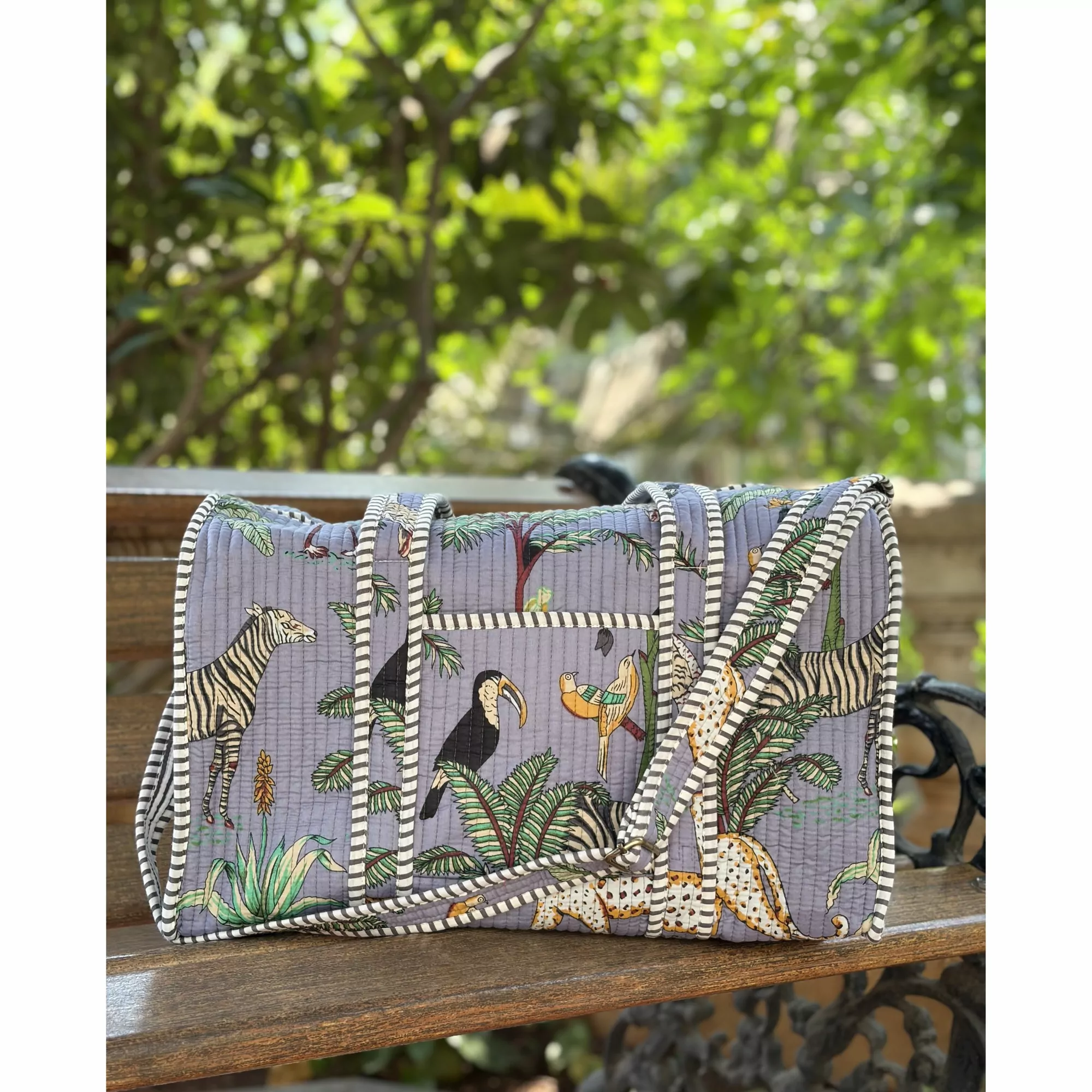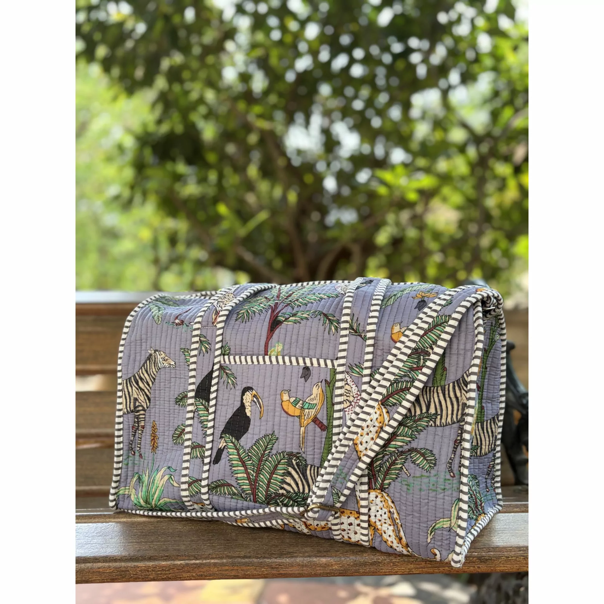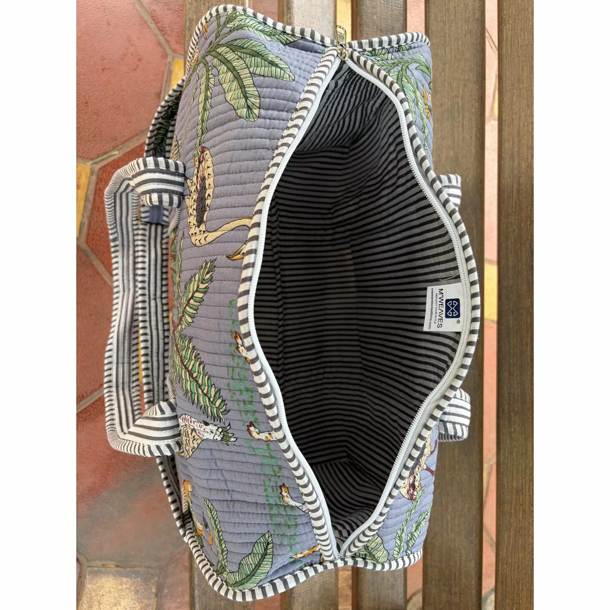 Travel in comfort and style with this Block Print Quilted Cotton Weekender Duffle Bag with Sling Belt – Light Blue (18"x 18"). Crafted from soft quilted cotton and detailed with traditional block print patterns, this bag blends timeless craftsmanship with everyday practicality. Spacious and lightweight, it is ideal for short trips, weekend getaways, gym sessions, or carrying extra essentials during travel. The bag features two convenient carrying options—a short handle for quick grip and an adjustable shoulder sling for comfortable hands-free carrying. A secure zipper closure keeps your belongings safe, while the pocket helps organize small items like keys, phone, or wallet. Stylish, functional, and easy to carry, this duffle bag is a perfect companion for travel and everyday use.