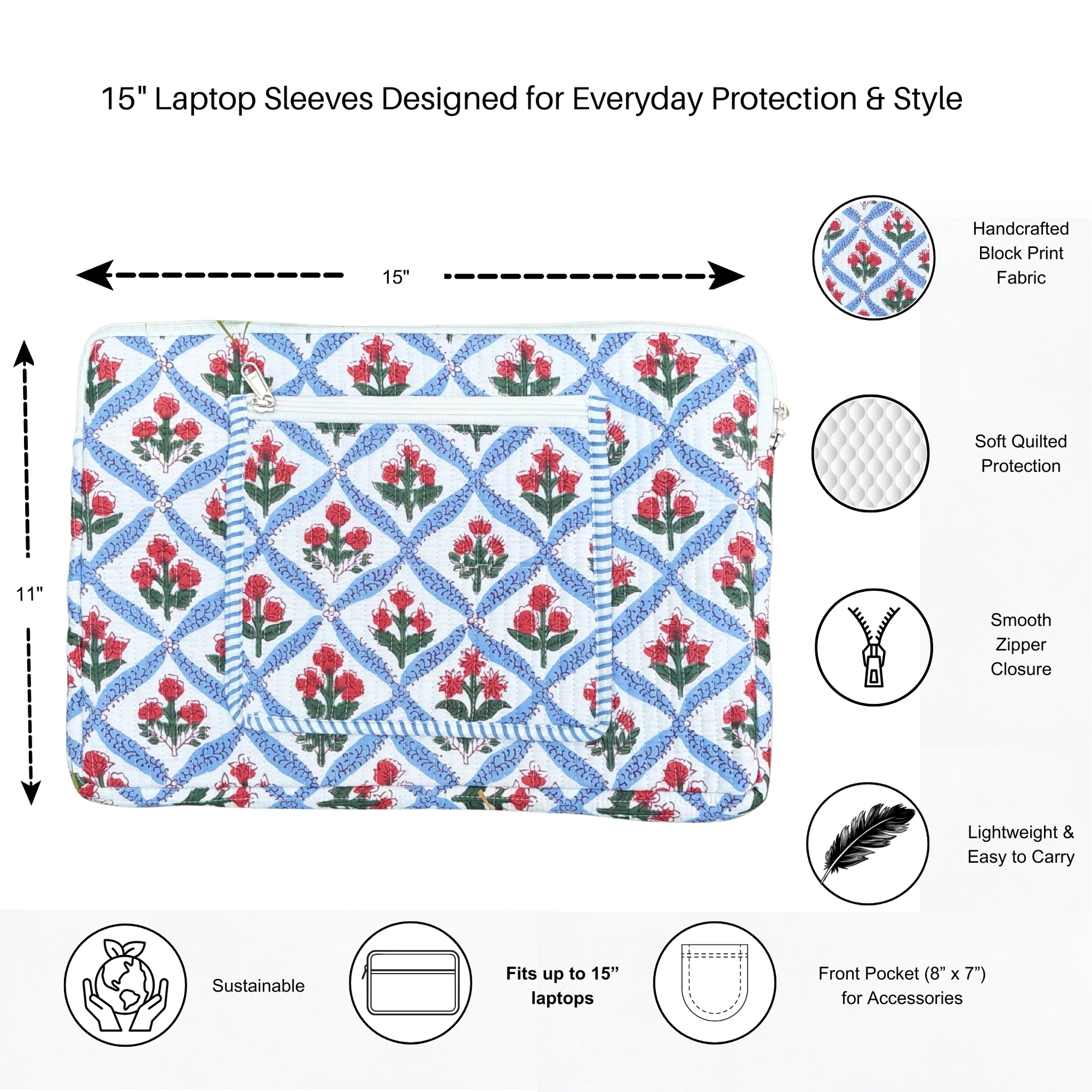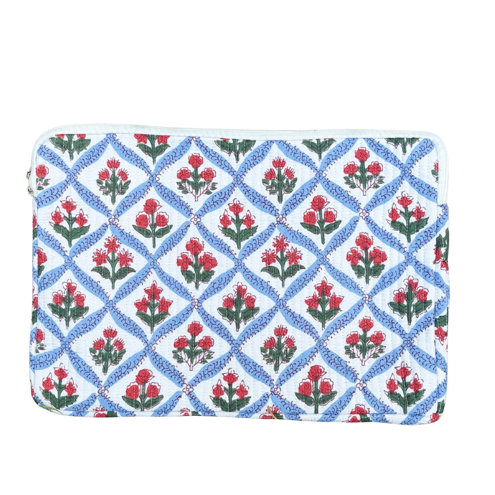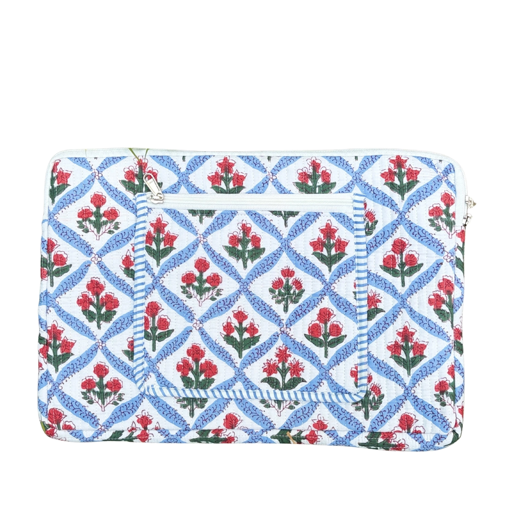 Protect your device in style with this Block Print Quilted Cotton Laptop Sleeve with Front Pocket. Crafted from soft quilted cotton and adorned with traditional block print patterns, this sleeve combines heritage craftsmanship with everyday practicality. The padded quilting helps cushion your laptop or tablet, while the zip closure ensures secure storage. A convenient front pocket provides additional space to keep essentials like a charger, mouse, cables, or small documents organized. Lightweight and easy to carry, this sleeve is ideal for daily office use, work-from-cafés, travel, or simply storing your device safely at home.