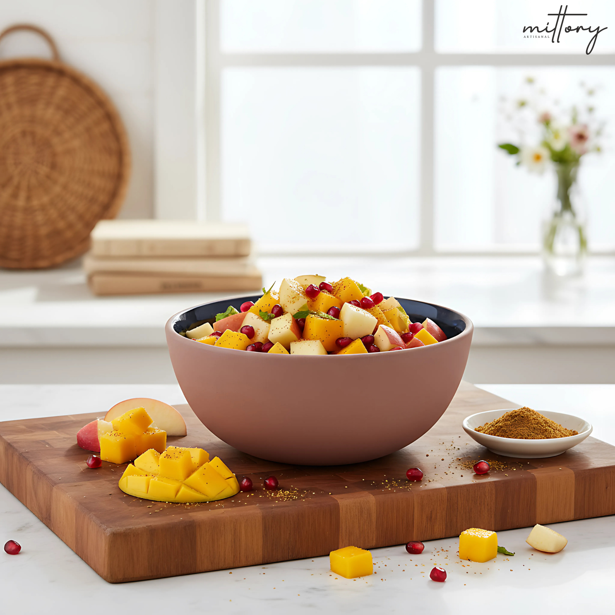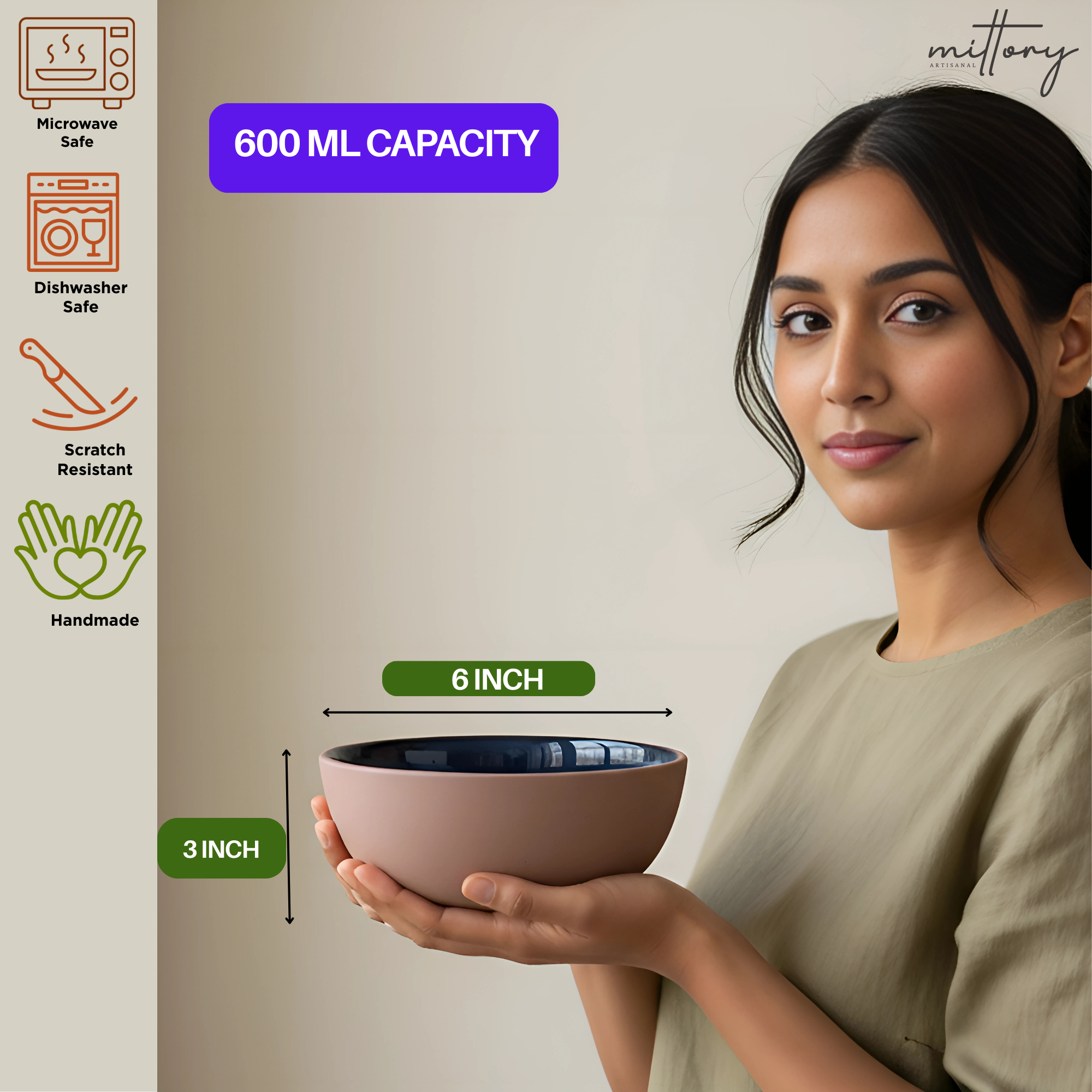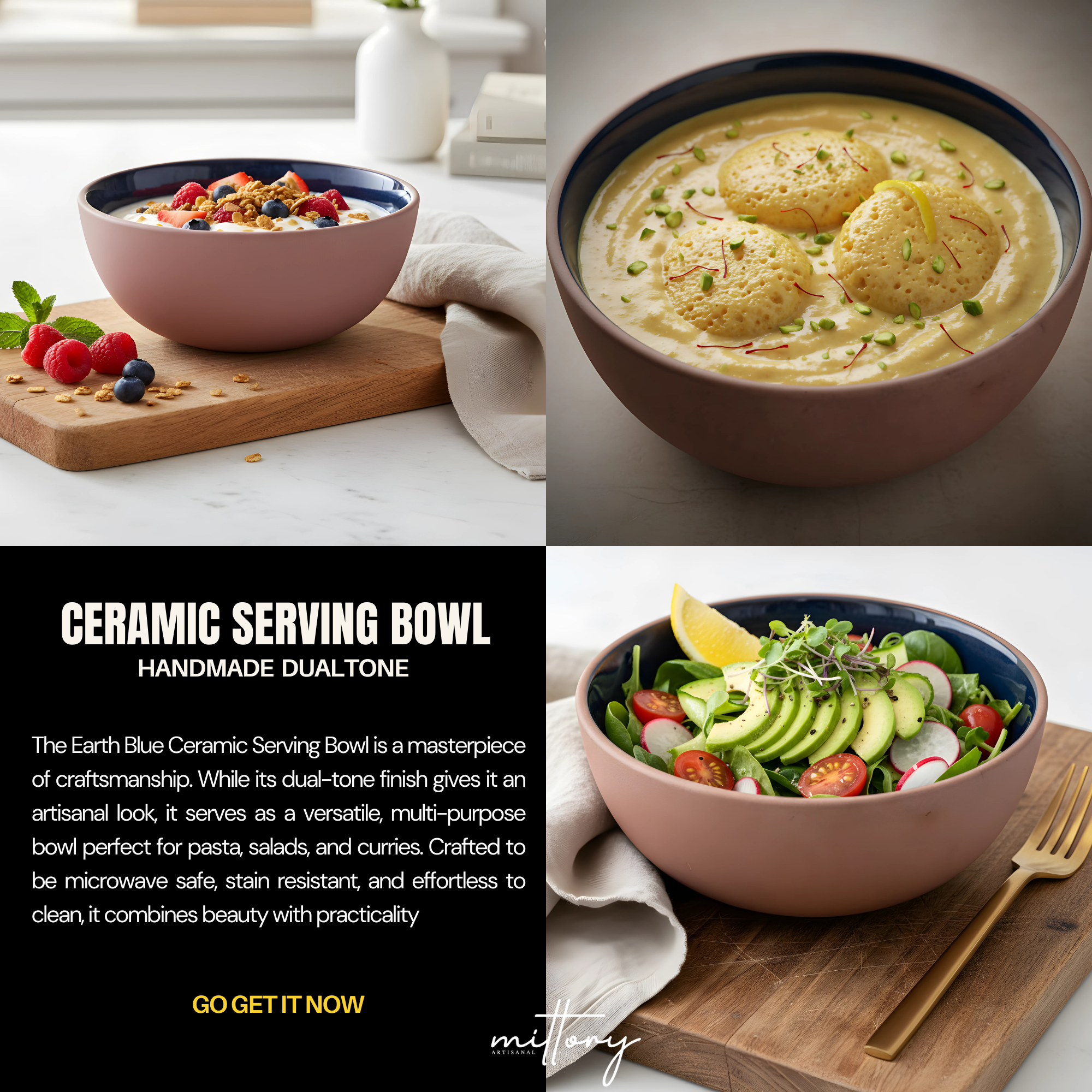 Introducing the Mittory Earth Blue Serving Bowl, an exquisite addition to your kitchenware collection that seamlessly combines functionality with elegance. This large serving bowl, with a generous capacity of 600 ml , is perfect for serving ample portions of soups, salads, pasta, cereals, and hearty comfort dishes. Crafted from high-quality ceramic, this handmade big serving bowl is a piece of aesthetic crockery design with a matte Earth Brown exterior and a electric blue glossy interior, making it a standout piece for any dining experience.