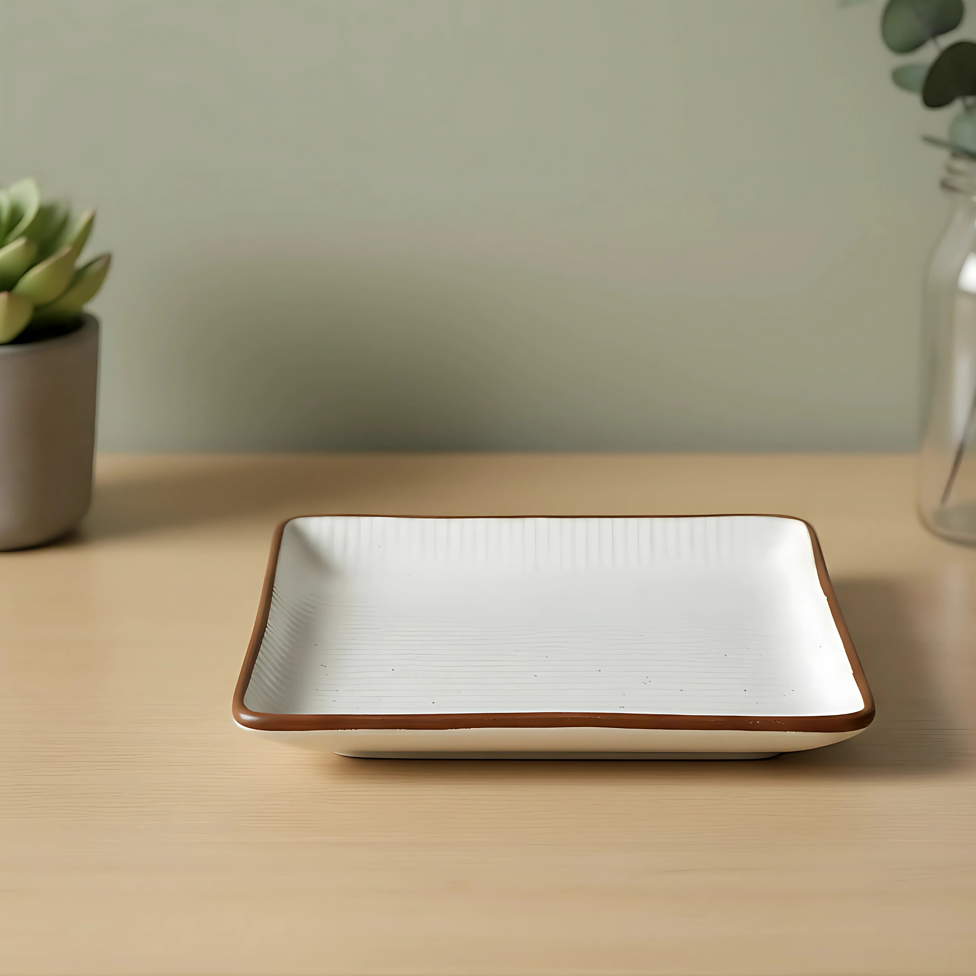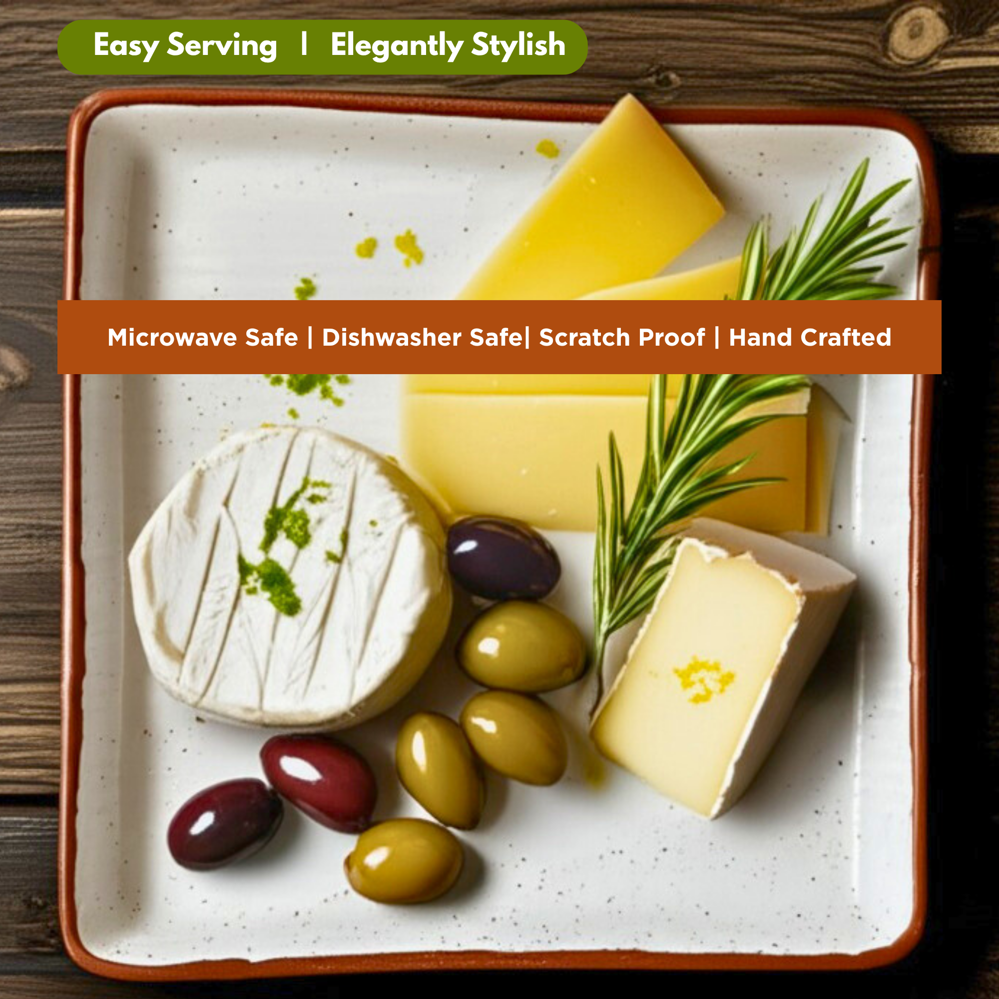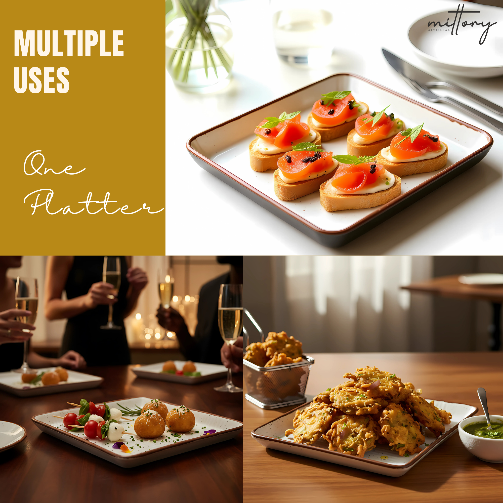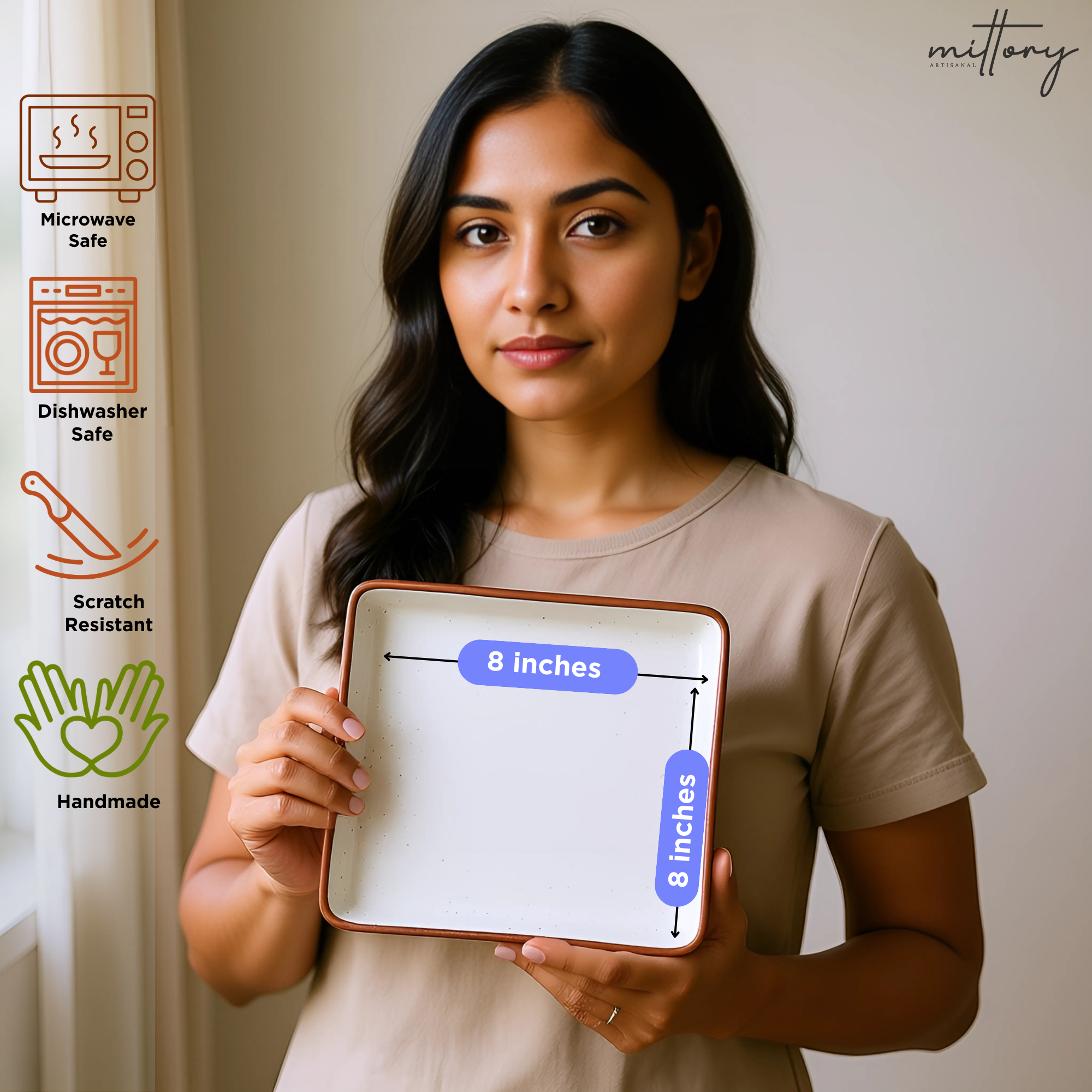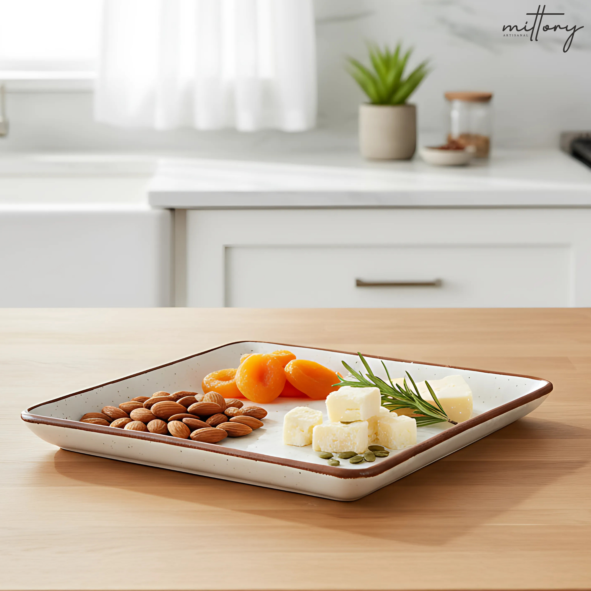 Mittory es una marca de artículos para el hogar contemporáneos que ofrece vajilla elegante y funcional para hogares modernos. La bandeja cuadrada de cerámica Mittory Classic presenta una construcción de cerámica de primera calidad con un acabado blanco roto sutilmente moteado y un borde marrón tierra que contrasta para una apariencia refinada y artesanal. ARTÍCULOS INCLUIDOS: 1 bandeja cuadrada de cerámica Mittory (20 x 20 cm). USO: Perfecta para servir aperitivos, pasta, ensaladas, postres o frutos secos; adecuada tanto para comidas diarias como para ocasiones especiales. TAMAÑO: Su forma cuadrada de 20 cm proporciona un amplio espacio para diversas necesidades de servicio. APTA PARA MICROONDAS para recalentar cómodamente y APTA PARA LAVAVAJILLAS para una limpieza sin esfuerzo. Su construcción de cerámica DURADERA es resistente a las astillas, no contiene plomo y resiste las manchas, lo que garantiza un uso prolongado. CUIDADO: Evite los limpiadores abrasivos para preservar la superficie brillante y el acabado. REGALO: Rigurosamente controlada en cuanto a calidad y empaquetada de forma segura, lo que la convierte en una opción ideal para regalos de inauguración de casa, ocasiones festivas o para añadir un toque artesanal a su mesa.