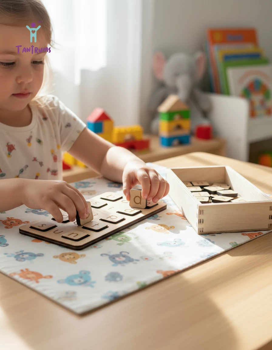 - CONJUNTO COMPLETO: Incluye un tablero de madera con espacios designados y múltiples bloques de letras para crear varias combinaciones de palabras.